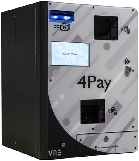 Accetta tutte le denominazioni di monete e banconote, fornendo il resto esatto al cliente.